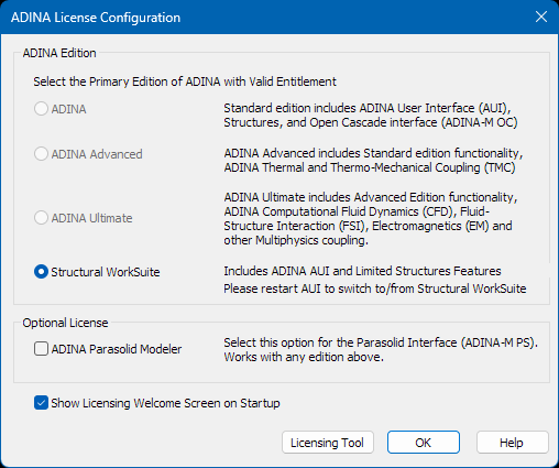 For Structural WorkSuite Entitlement holders, a new product called ADINA SWS has been created and may be selected when launching the ADINA AUI.