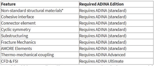 As noted in the ADINA 2025 Release Notes, some features of the standard ADINA license are restricted in the ADINA SWS. The following table clarifies those limitations: