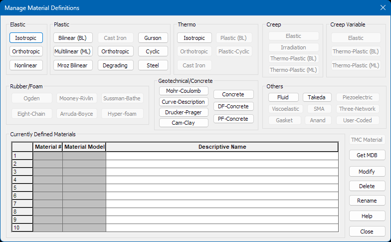 Materials which are not allowed in ADINA SWS are greyed out in the Manage Material Definitions dialog box within ADINA AUI, but advanced structural materials including plastic steel, isotropic thermo, and several advanced concrete materials are included:
