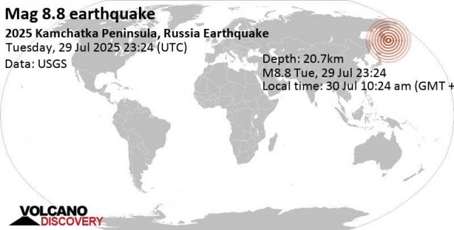 On Wednesday, July 30, a strong 8.8 magnitude earthquake rattled Russia. According to the U.S. Geological Survey (USGS), the earthquake occurred around 23:24:50 UTC, with its epicenter located 119 km east-southeast of Petropavlovsk-Kamchatsky, Russia. The depth of the quake was 20.7 km. Fortunately, the epicenter was in a sparsely populated area; therefore, no fatalities or severe injuries were reported.