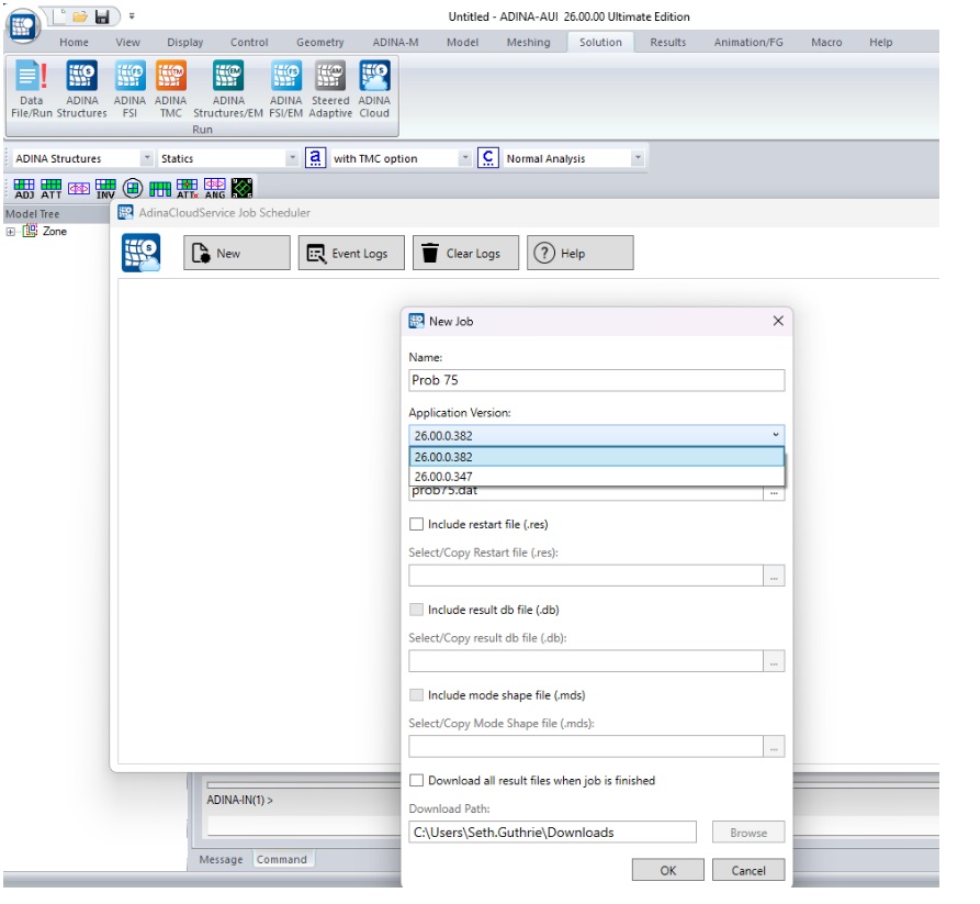 The ADINA Cloud Service for managing ADINA structural simulation jobs through the Bentley Analysis Cloud Service has been added. This feature allows the user to analyze an ADINA data file using the ADINA Structures solver on a virtual machine hosted by Bentley Systems.