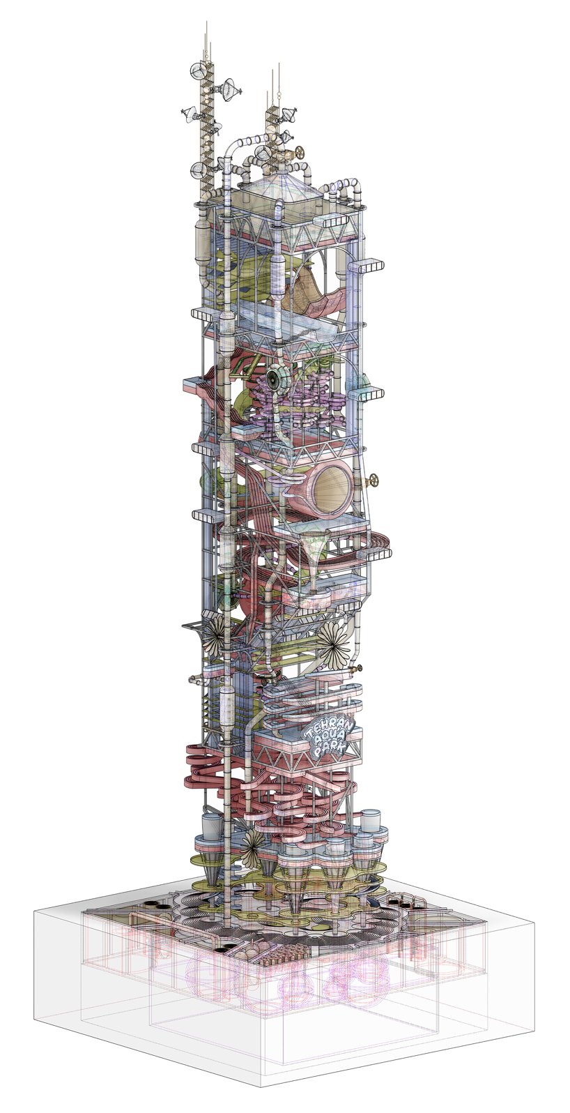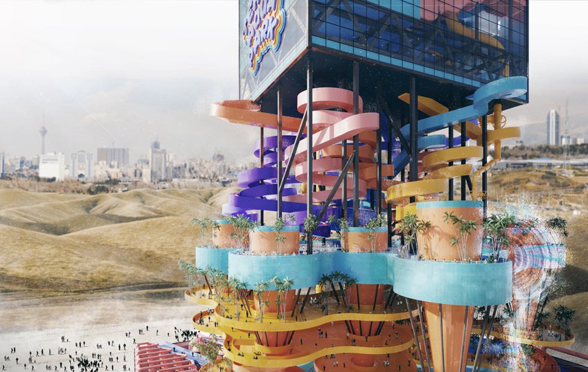 Designers envision the 560-meter skyscraper project to be constructed on top of the abbas abbad hill in the capital of Iran, Tehran. Glass facades will be implemented so that the park will be visible from the outside of the building. The high-tech facility that will constantly mine crypto-currencies will be located below the water park.