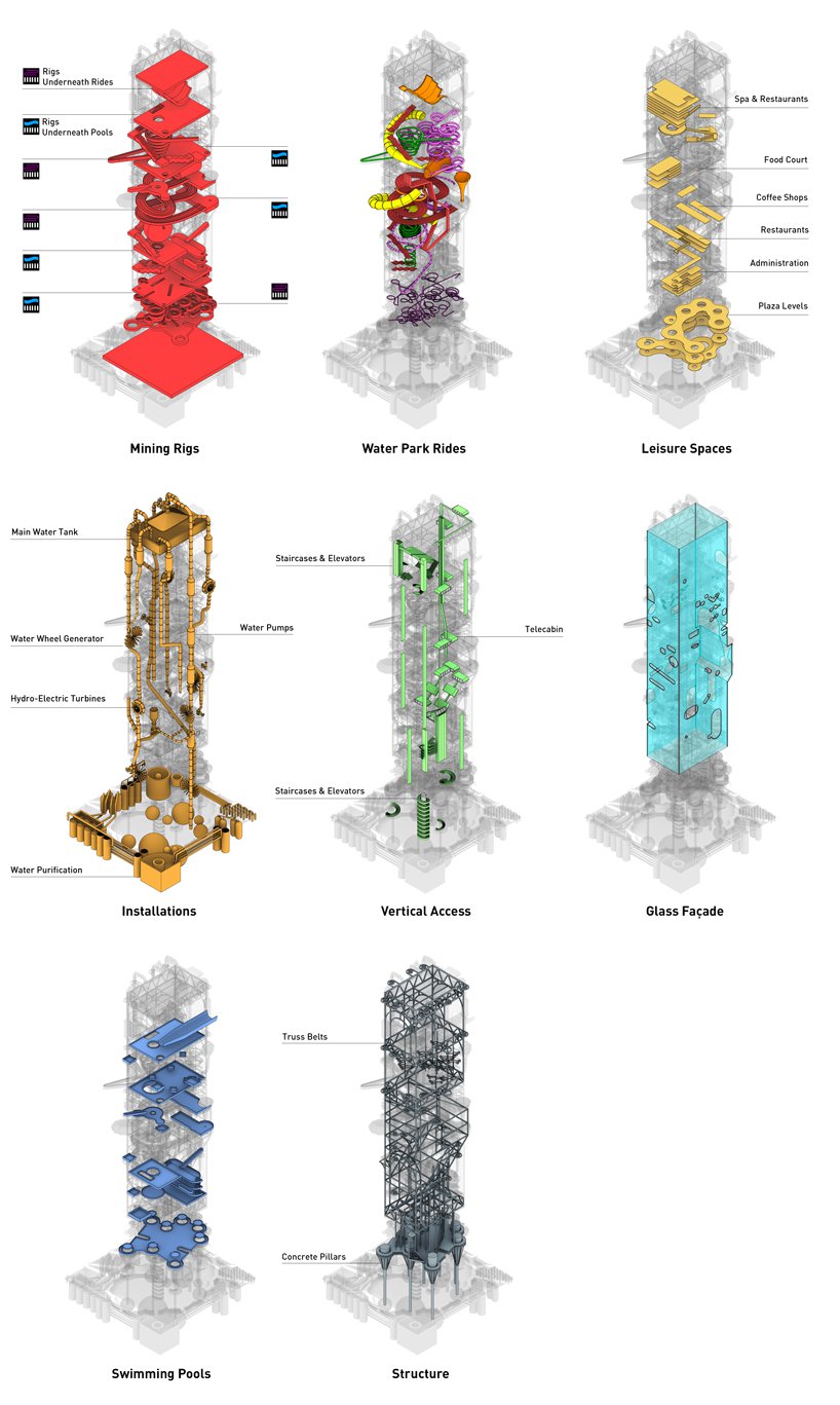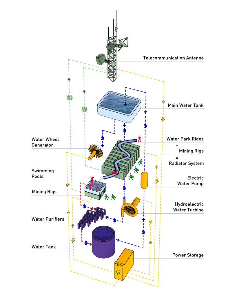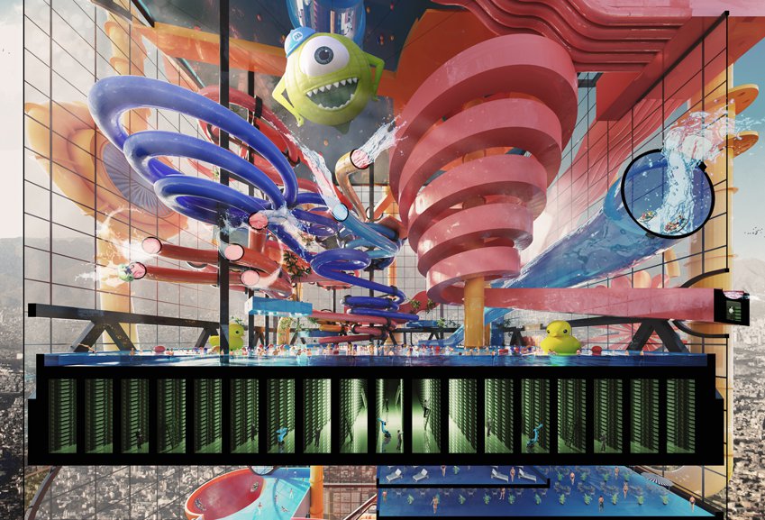 A new project, designed for the 2019 Evolo Skyscraper Award, involves the construction of a skyscraper that will contain a water theme park, hiding an enormous cryptocurrency mining facility inside.