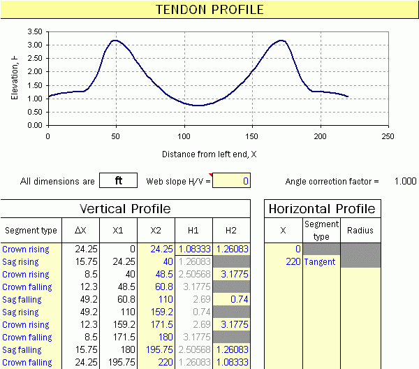 The PSLoss spreadsheet calculates elongation and immediate friction and anchor set prestressing losses in post-tensioning tendons. Tendons may follow a three-dimensional profile and can be jacked from one or both ends. PSLoss enables the generation of tendon profiles containing multiple curves and tangents, and it also computes the vertical and horizontal loads equivalent to the effects of post-tensioning. These forces can then be applied to the beam to determine both primary and secondary post-tensioning moments. The program has been successfully used on a wide range of bridge projects and has proven reliable in checking post-tensioning shop drawings with accuracy.